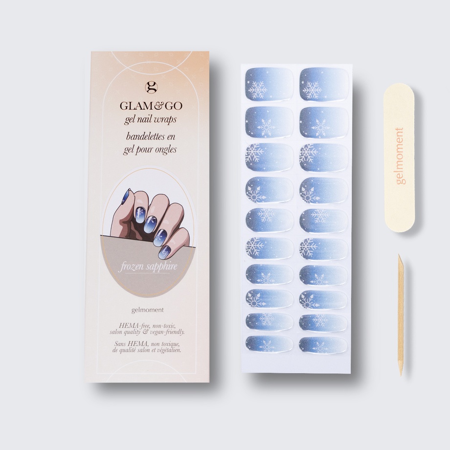 Our GLAM & GO gel nail wraps ensure that no matter how complex your chosen nail design, the application process remains incredibly simple. Our GLAM & GO gel nail wraps require no glue, base coat, or top coat—just peel them off the packaging, apply them to your nail, trim to size, cure twice, and voilà!